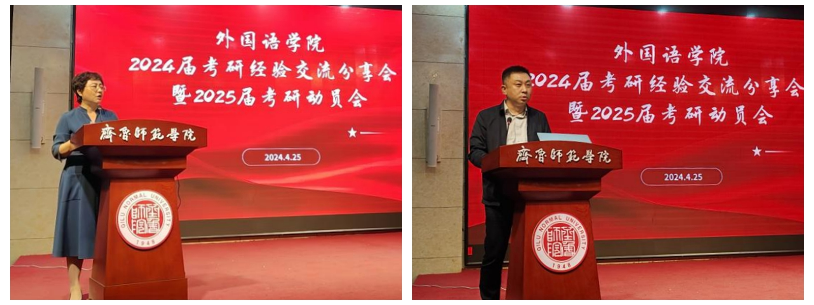 为充分发挥优秀考研学生的榜样引领作用,进一步加强学风建设,全面调动2025届学生的考研积极性, 4月25日晚,外国语学院举行2024届考研经验交流分享会暨2025届考研动员会。学院党委书记于江、院长宋秀葵、副院长陈锋、团总支书记牛荦、团总支副书记王伟,毕业班辅导员、班主任及2024届考研上岸学生代表、2025届全体本科学生参加会议。会议由学院党委副书记迟英娟主持。