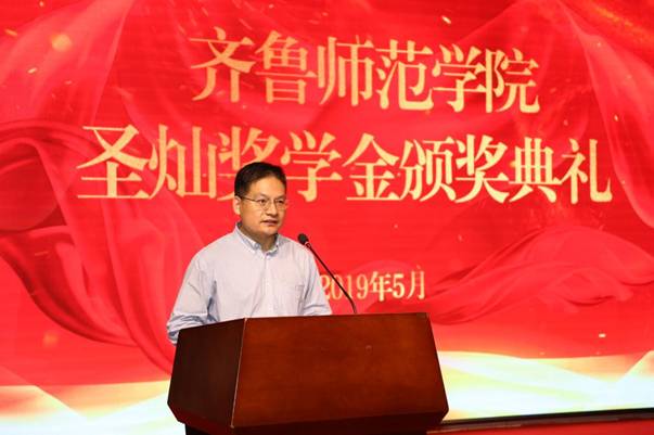 5月16日下午,2019年“圣灿奖学金”颁奖典礼在章丘校区图书馆报告厅举行。党委副书记、校长林松柏,党委委员、副校长张福建和我校青岛校友会会长、青岛银色世纪健康产业集团有限公司董事长邹圣灿出席典礼,学生工作部副部长、校友办公室主任郝克宁,文学院院长杨峰、党总支副书记于江、副院长李术文及文学院300余名师生参加典礼,典礼由张福建副校长主持。
