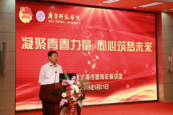 为深入学习贯彻习近平新时代中国特色社会主义思想和党的十九大精神,推动形成学习习近平总书记在纪念五四运动100周年大会上重要讲话精神的新高潮,引导广大学生认清时代责任、明确奋斗目标,5月21日下午, 2019全国向上向善好青年、团市委常委、市青年宣讲团团长、市城肥清运管理一处清除二队班长陈国瑞,天下第一泉风景区服务中心环城园区解放阁班长王霄,章丘广播电视台主持人滕飞,瑜伽教练徐菲4位济南团市委青年宣讲团成员应邀来我校,以“凝聚青春力量,同心筑梦未来”为主题,面向各学院团总支书记、副书记、辅导员以及学生代表300余人开展宣讲交流。党委委员、副校长张福建出席活动。