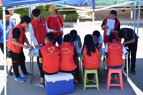 献血车来之前,志愿者们一起搬桌椅、搭帐篷,迅速完成前期的准备。献血车到达后,志愿者们细心地听医生们讲解相关献血流程和注意事项。在献血前,志愿者首先询问献血者是否符合献血条件,引导符合条件的同学填一份义务献血表格以及报名表。然后帮助医生对献血者进行血压的测量、化验血型等基本检测,为献血前没吃过饭的同学准备面包,随后引导献血者进入献血车等待抽血。