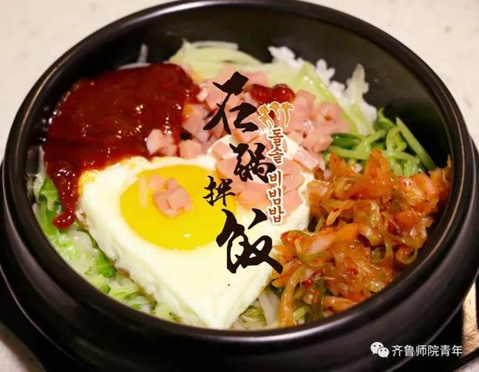 石锅拌饭:烫手的石锅,热腾腾的白饭,金色的蛋黄,酸辣的泡菜,吃到最后,锅底的米饭干干脆脆,很有嚼头。真的是色香味俱全,一点也不输校外的石锅拌饭,即便是爱吃石锅拌饭的行家,也得给它一个高高的评价。