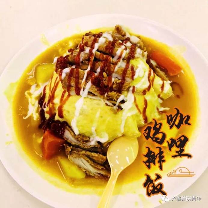 咖喱蛋包饭:咖喱源自印度,本来的味道是辛辣浓郁的。姜黄色的汤汁与洋葱泥、葱姜蒜等一起熬煮,后来慢慢变成不辣的,香料也没有了许多限制。在寒冷的冬天里,坐在食堂用小勺轻轻切下一块包裹金黄色蛋饼的饭团混在咖喱汁中,让每一粒米都裹上汤汁,再加鸡排的酥脆,咖喱鸡排蛋包饭简直就是大爱!