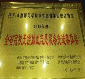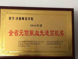 近年来,我校高度重视无偿献血工作,涌现出许多无偿献血先进事迹和先进个人。2016年,我校张雷等2人获得国家卫计委、中国红十字会、中央军委后勤保障部卫生局联合表彰,荣获 “全国无偿献血志愿服务二星奖”。在刚刚下发的《关于表彰2016 年度全省高校无偿献血工作先进集体和先进个人的决定》鲁高工委【2017】49号文件中,我校在2016年度全省88所无偿献血先进高校中名列前茅,荣获“无偿献血先进高校”奖。校学生会青年志愿者协会荣获“无偿献血志愿服务先进集体”奖。我校李海涌、孙建凯荣获“无偿献血工作先进个人”奖。孙成彬、徐惠洁荣获“无偿献血爱心大学生”奖;院田田等20人荣获“无偿献血志愿服务先进个人”奖。