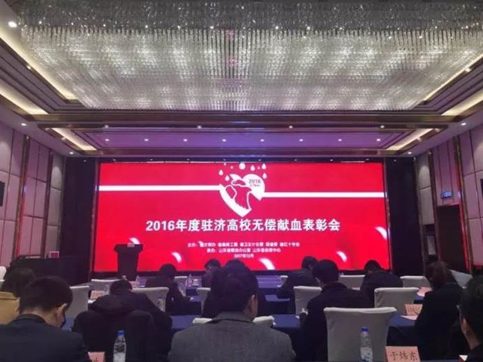 2017年12月7日,2016年度驻济高校无偿献血表彰大会在山东大厦齐鲁厅开幕。本次会议由省文明办、省委高校工委、省卫生计生委、团省委、省红十字会主办,省献血办公室、省血液中心承办。荣获2016年度全省高校无偿献血表彰的先进集体和个人以及大众日报、齐鲁晚报、生活日报、人口健康报、山东电视台齐鲁频道、健康咨询频道、山东人民广播电台、山东广播电视台融媒体中心、省卫生计生委宣教中心等新闻媒体参加会议。