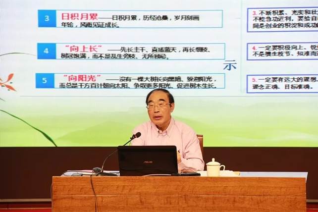 当讲到“大树理论”时,韩教授提到基厚根深、本固枝荣、日积月累、向上长、向阳光是五个做人的基本要求,他告诫我们做人要光明磊落。