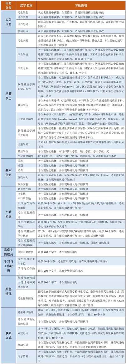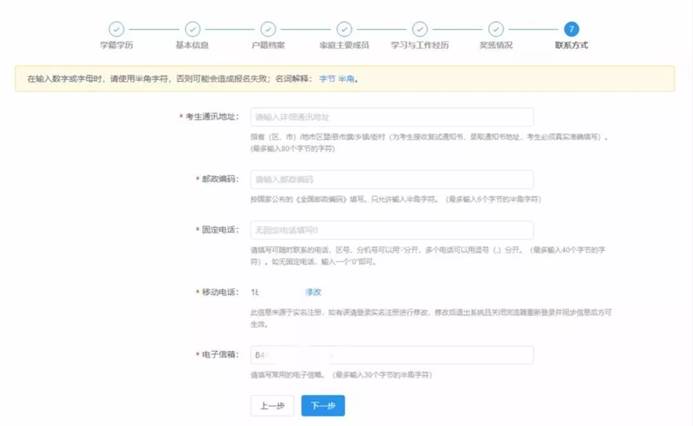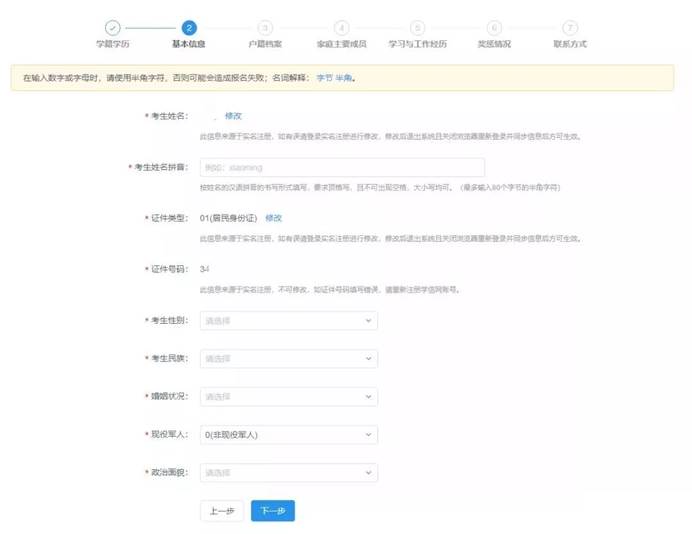 填写考生信息(学籍学历、基本信息、户籍档案、家庭主要成员、学习与工作经历、奖惩情况、联系方式)。填写考生信息时,请认真阅读报名页面的提示信息,准确填报,带*的文本框为必填内容,证件号码等使用半角英文输入法输入;考生填写学历(学籍)信息进行网上校验,考生可查看学历(学籍)校验结果,未能通过学历(学籍)网上校验的考生应在招生单位规定时间内完成学历(学籍)核验;家庭主要成员和学习与工作经历均至少要完整填写一项;