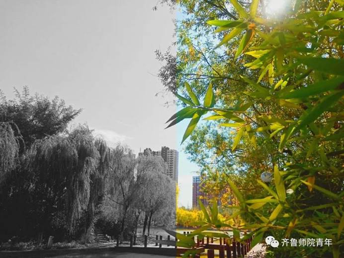 回眸一转,落日的余晖透过斑驳的树叶,打在河畔边,小桥上……镀起了一层闪烁的金边,蓝天、碧水、绿树、小桥、余晖,遮掩了宁静的住宿楼,使其屈于一隅,诗情画意的小桥落日图便映入眼帘。相较而言的水墨图,多了几分幽静与寂寥,垂柳弯于池水,黑白中平添几分素雅美。