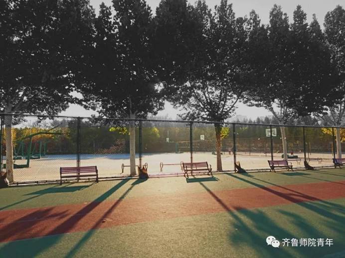 水墨与彩色碰撞在整个画面,如墨散开又聚拢在师院的操场。红绿相间的跑道散发着蓬勃的朝气,光线在长凳边停靠,原木与阳光相拥,青春与色彩相融。
