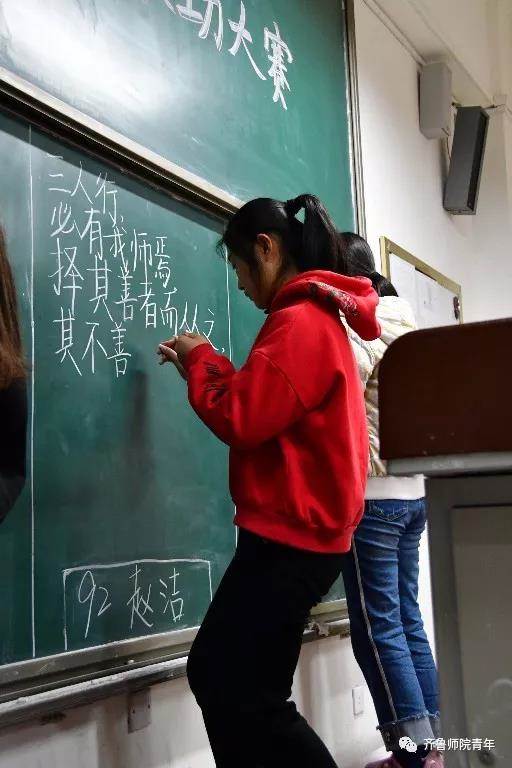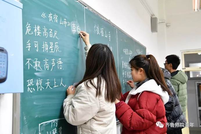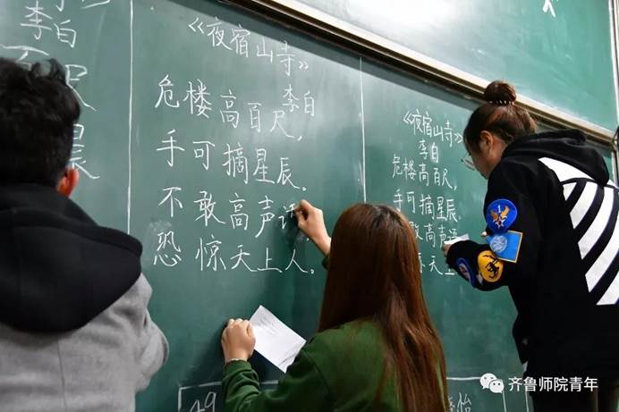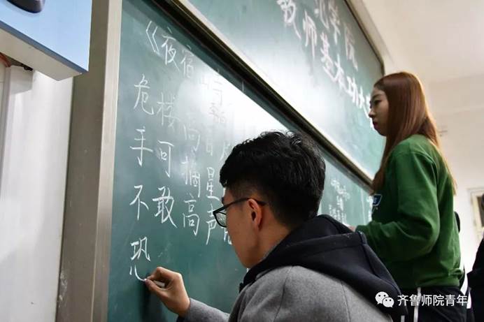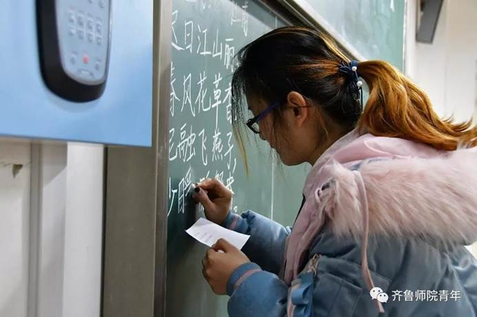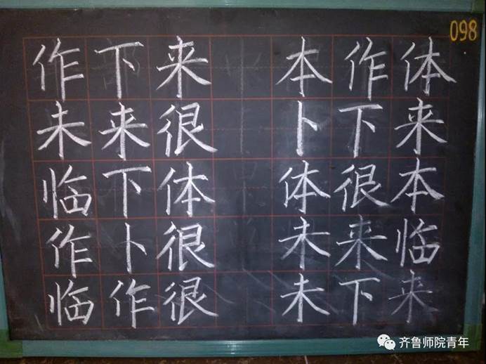 抗战时期,一块木板都是黑板,一块红砖就是粉笔;中华人民共和国成立以后,学堂里,一个小屋,一块黑板,就开始了扫盲工作;到如今,新媒体教学方式的出现,使粉笔字的作用逐渐减弱了。通过本次大赛,同学们发现了粉笔字的魅力,在以后的工作里,也会发挥粉笔字的积极作用和意义。