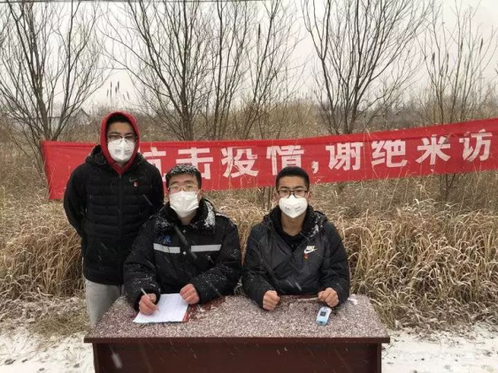 1月27日大年初三清晨,在东营市河口区新户镇北台子村南口路边,悬挂着一条大红的横幅“抗击疫情,谢绝来访”!横幅前一张会议桌,桌上有一支红外体温计、一摞登记表,三个戴着口罩的年轻人正在执勤。其中有对双胞胎兄弟特别引人注目,哥哥叫郭奎森,弟弟叫郭奎林,他们都是齐鲁师范学院体育学院的在校学生,哥哥大四、弟弟大三,都是中共预备党员。