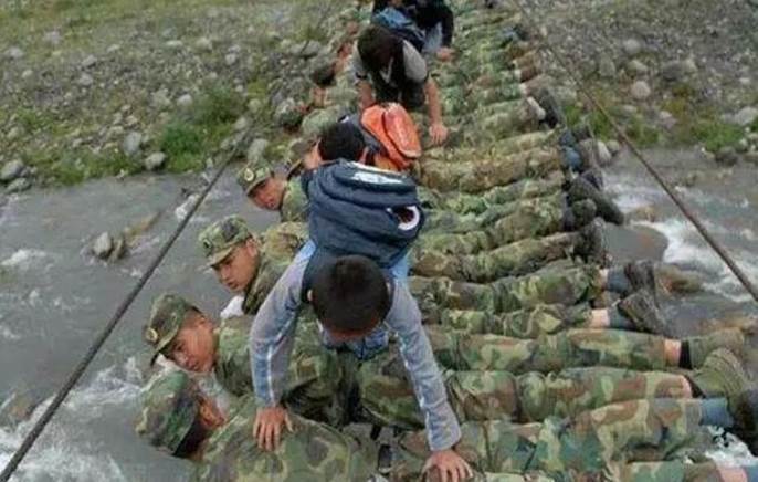 ▲2008年6月,四川省地震灾区彭州市湔江河边,战士趴在还没有修完的铁索桥上,组成临时的“人桥”,让小学生们从自己的脊背上爬过。
