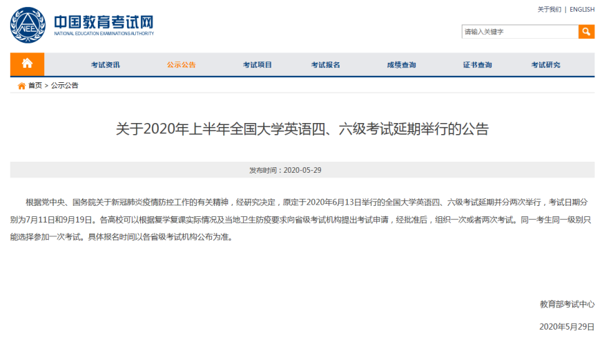 英语四、六级考试延期举行的公告