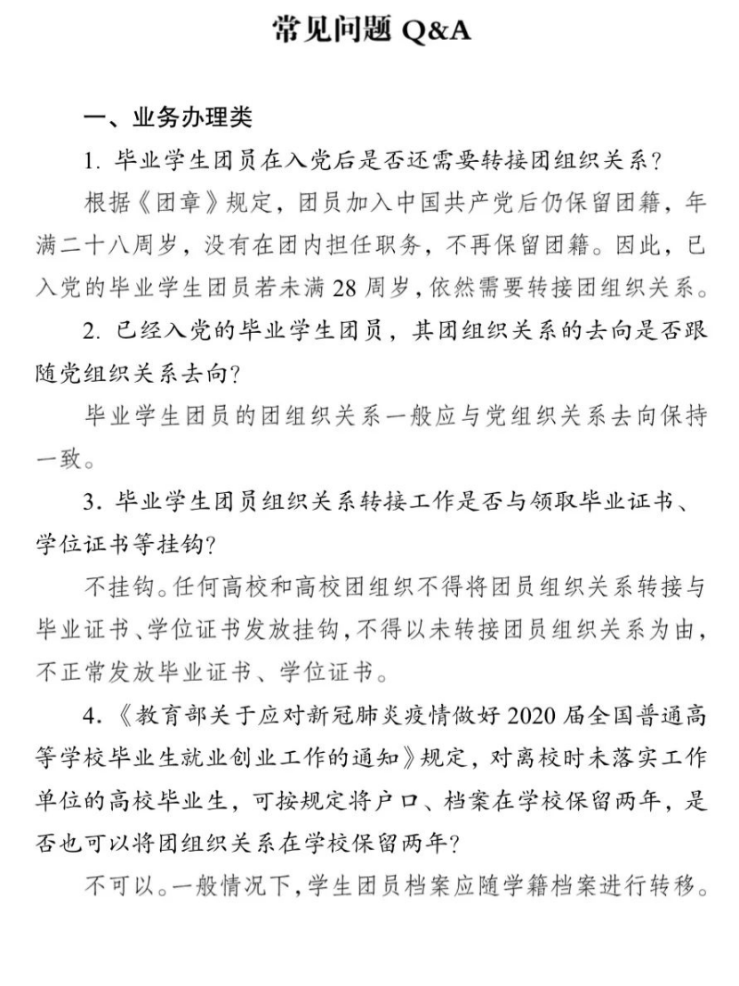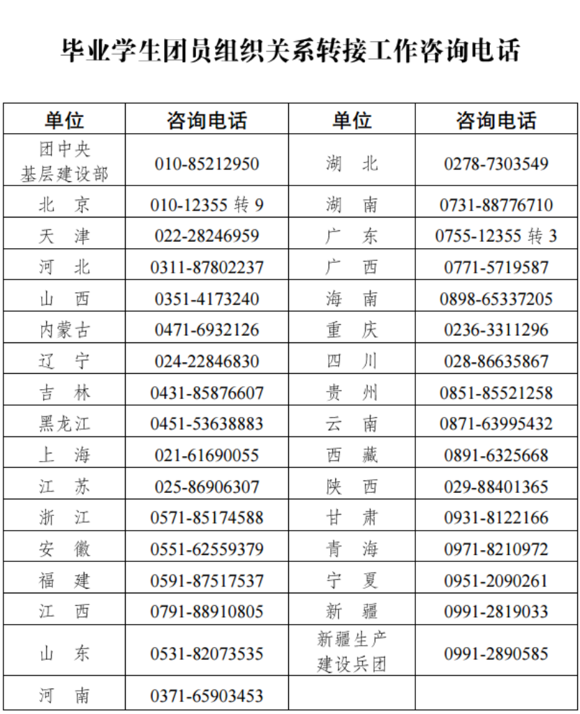 各级团组织要认真做好毕业学生团员的团员档案核查和组织关系转接工作,积极主动为广大团员提供贴心的帮助和服务。同学们在转接组织关系过程中,如果遇到困难或疑问,可登录“智慧团建”系统网页(zhtj.youth.cn/zhtj)查询相关工作流程,可咨询当地相关基层团组织,也可与团中央及各省级团委联系。