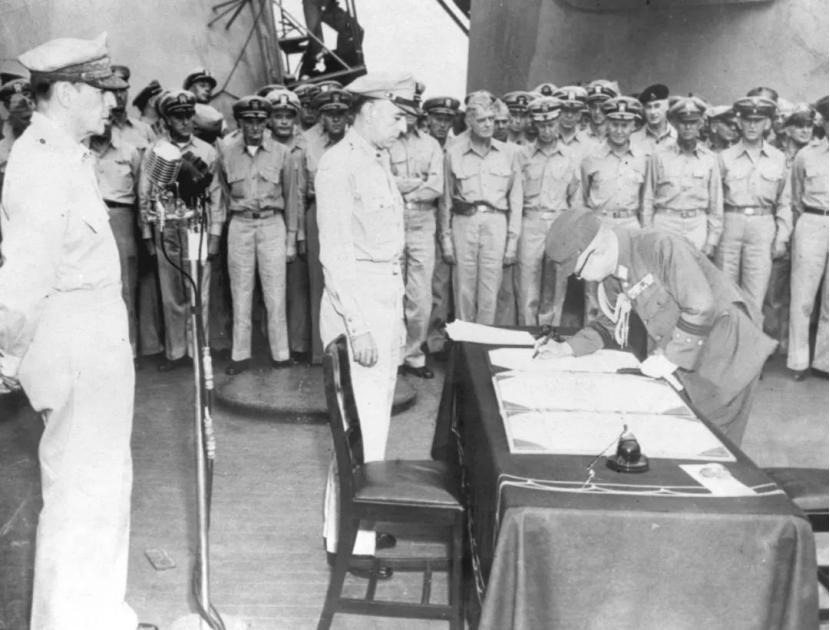 1945年9月2日,日本投降仪式在东京湾“密苏里”号战列舰上举行。图为日本陆军参谋总长梅津美治郎(前排右)在