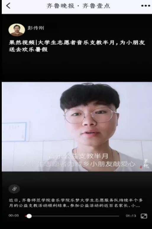 在齐鲁晚报•齐鲁壹点和校团委的支持帮助下,音乐学院“乐梦”服务队加入“齐鲁志愿者”团队,开展2020年大学生暑期“三下乡”活动。为期半个多月的线上线下相结合的公益“云课堂”支教项目,为数十名城乡小朋友免费授课,提供音乐、器乐和舞蹈相关知识和技能的帮助。“新形势新方式,线上支教显风采”。受疫情影响,并结合音乐舞蹈类特点,今年我们采取了“线上支教”这一全新支教模式,志愿队建立了音乐学院服务队QQ群。通过同学们与媒体的助力,对QQ群进行了宣传,让乡镇的孩子及学生家长入群,志愿者在群内分成两组值班全天候为学生及家长答疑及分配一对一老师,此举赢得家长孩子及记者一度好评。