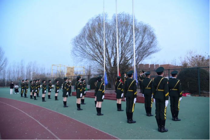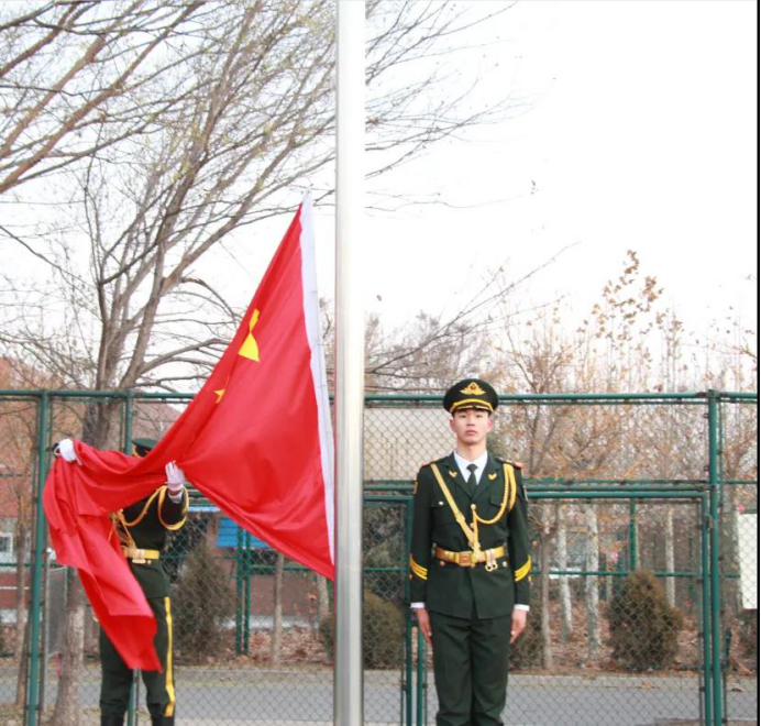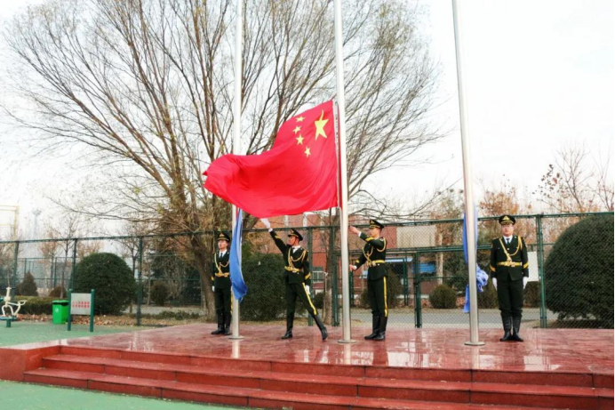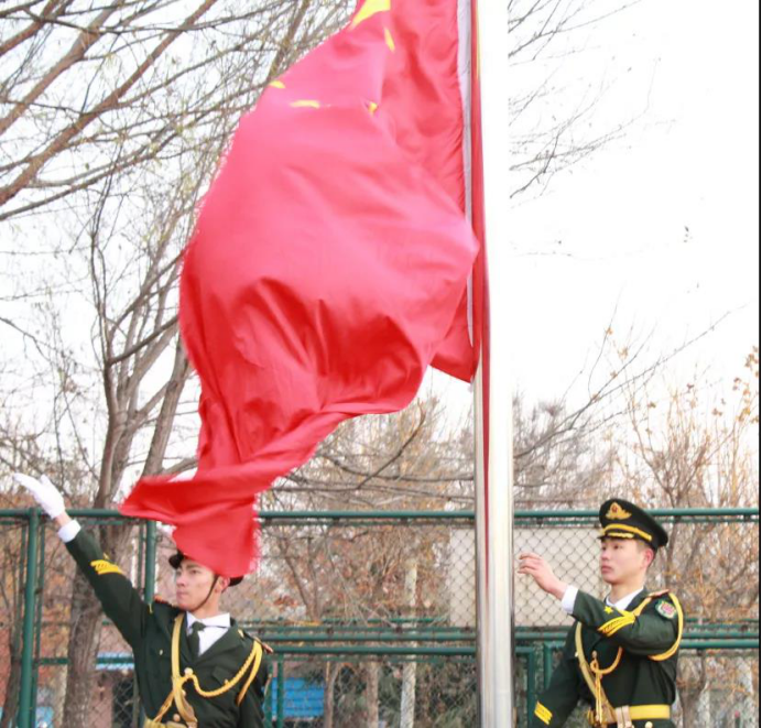 1. 七点整,国旗护卫队擎着国旗入场,在庄严的国歌声中,同学们齐声跟唱、行注目礼,目送国旗缓缓升起。