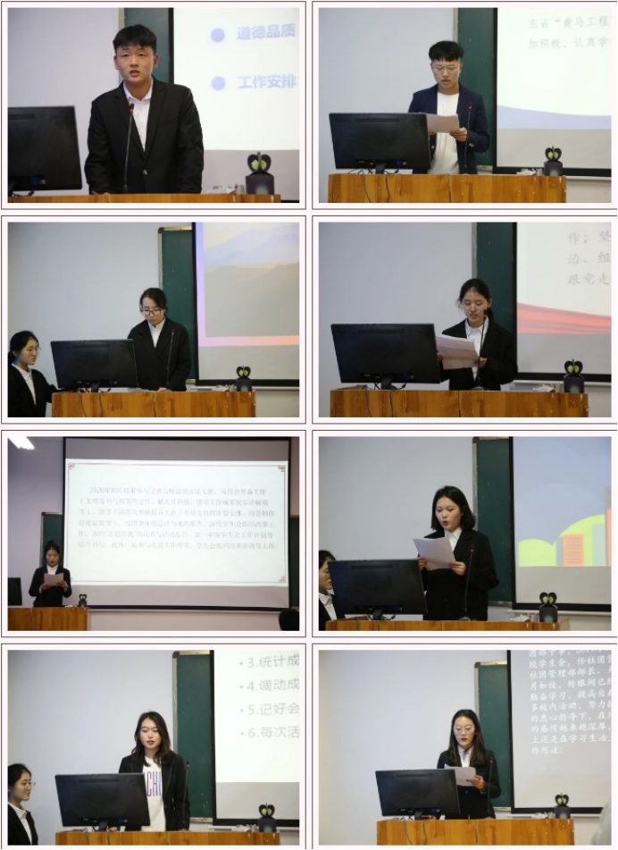 随后述职评议会正式开启。学生会主席团成员以及文化艺术部、社团实践部、青年发展部、基层建设部、科技创新部、新闻宣传部的负责人依次进行了现场述职。从现场述职情况可以看出,述职人员均进行了精心准备,能够按照《齐鲁师范学院关于开展2020-2021年度学生会工作人员述职评议工作的通知》进行系统全面、主次分明、层次清晰的述职汇报,展现出良好的述职评议效果。