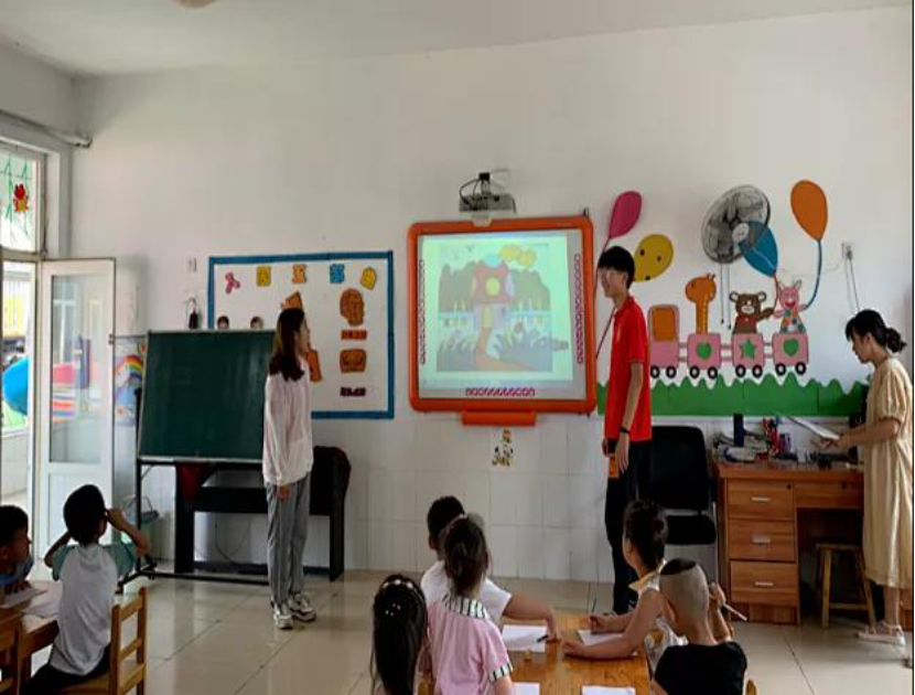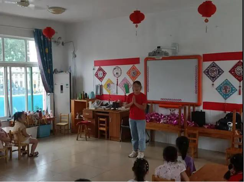 在教室里,齐鲁师范学院星光服务队教导小朋友们唱《红星闪闪》、《歌唱祖国》、《没有共产党就没有新中国》等经典红色幼儿歌曲,一起学习了红色幼儿舞蹈,小朋友们以自己的舞蹈作为礼物表演给星光志愿者们,现场洋溢着童趣纯真的气息。通过歌舞形式使小朋友们进一步地理解了红色文化,在歌舞中,他们感受革命先辈们的智慧和艰苦奋斗,也更加懂得了珍惜来之不易的幸福生活。