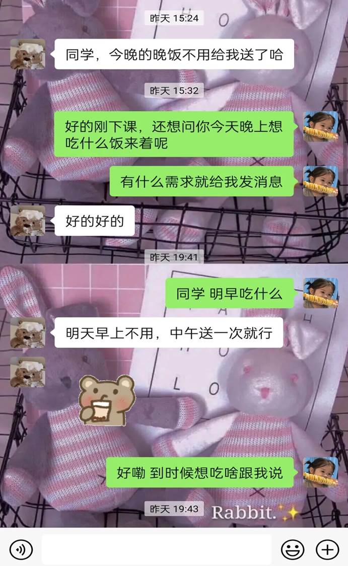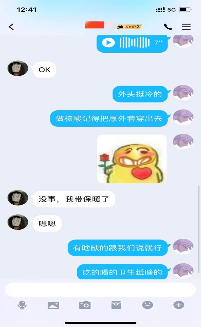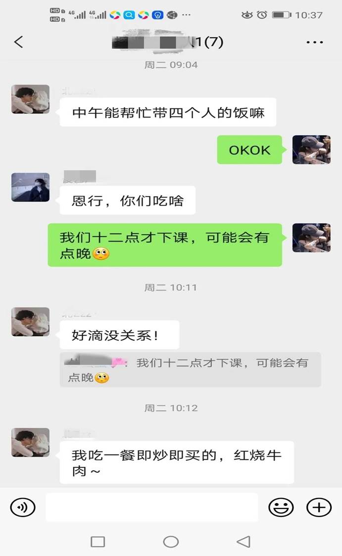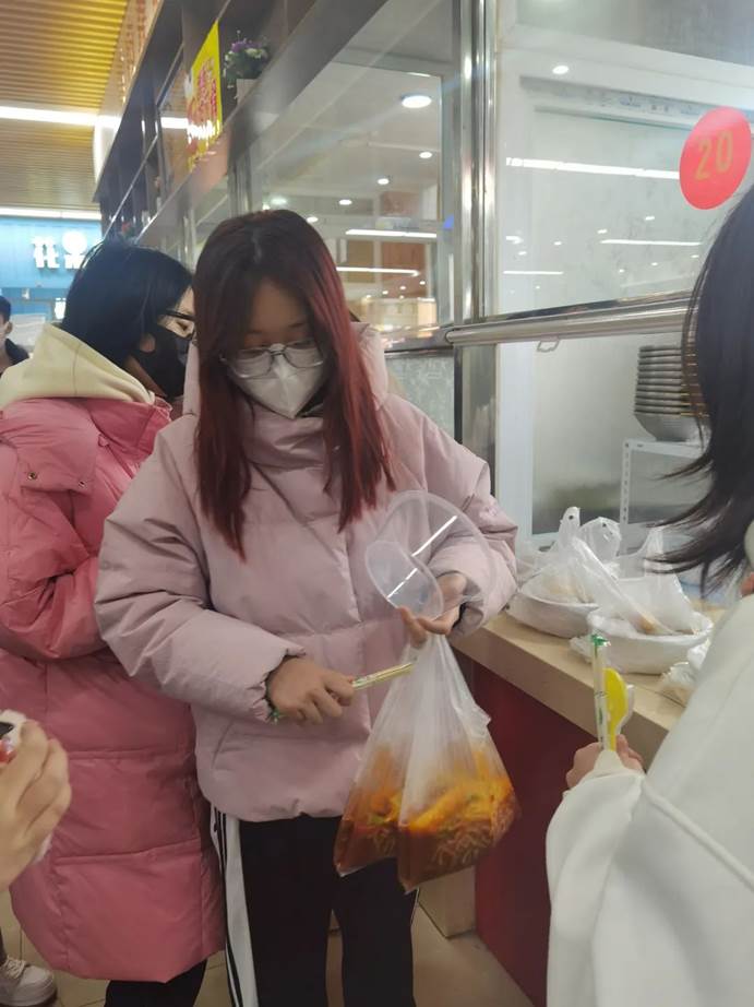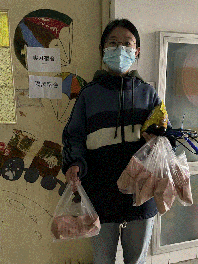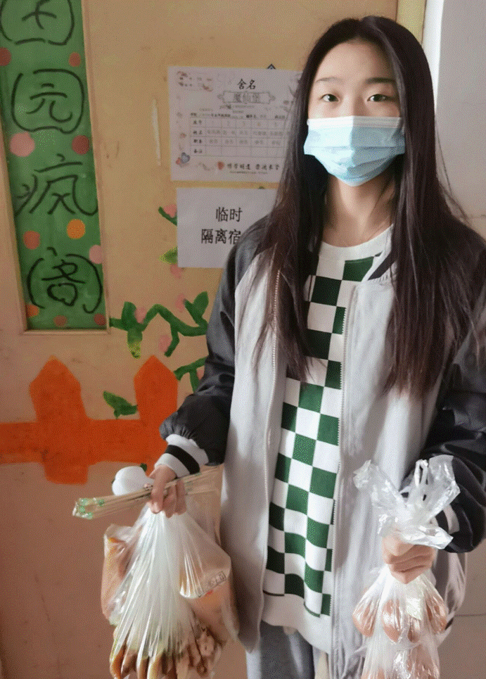 “我印象比较深刻的是隔离同学十分体贴,体谅到我们四处买饭不便,都选在同一个食堂窗口的食物,减少我们的跑动;有时为了不麻烦我们,他们选择去做核酸检测时自己顺道扔掉垃圾。让我感觉到我们的帮助和温暖是相互的。”