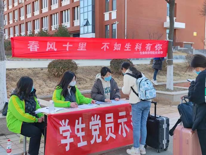 今天,我院开展返校工作,学生党员先锋队提前到达迎接现场,设置“学生党员示范岗”为迎接返校学生做好准备。他们背后的“春风十里 不如生科有你”让生科学子嘴角微微上扬,感受到生科院大家庭的温暖。党员们热情周到、细致入微,在迎接过程中,他们身处每个需要的角落,主动接过沉甸甸的行李箱,引导返校学生有序登记报到。