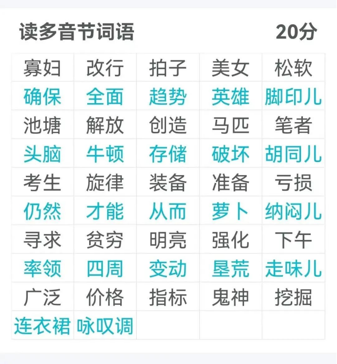 普通话考试中,第二题读多音节词语,字不能念错,尤其是易错字和多音字。有儿化词,要掌握拼读规律。
