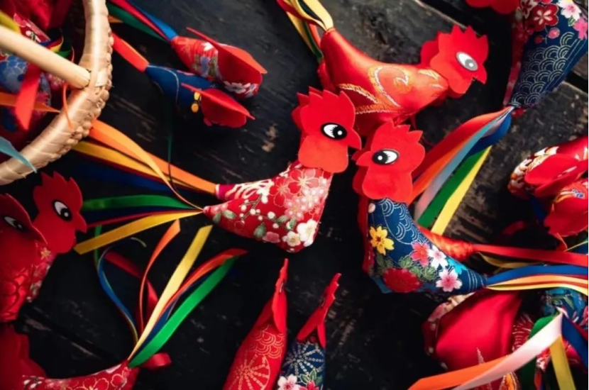 戴春鸡是立春之日古花的风俗。人们用布制作小公鸡,缝在小孩帽子的顶端,表示祝愿“春吉(鸡)”,预示新春吉祥。