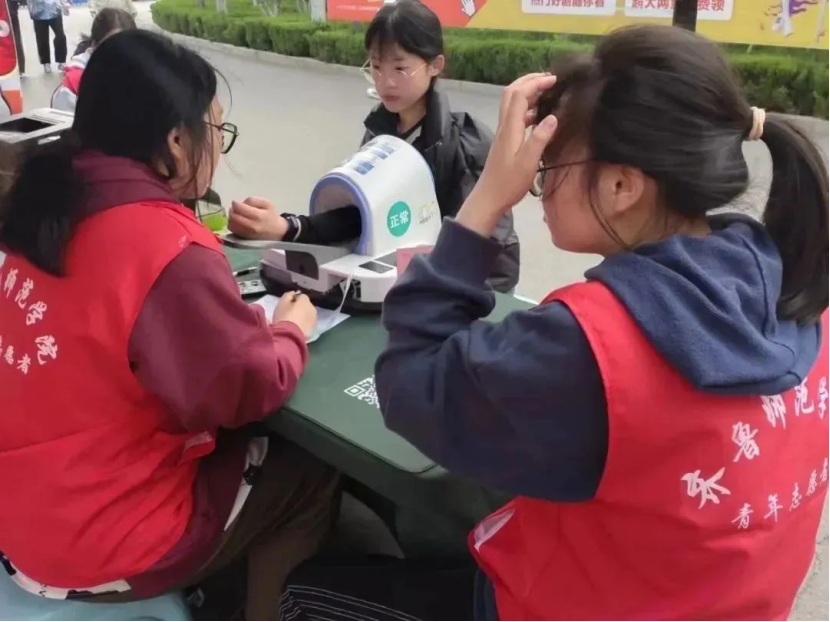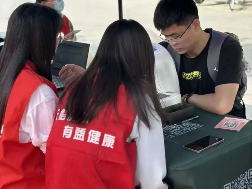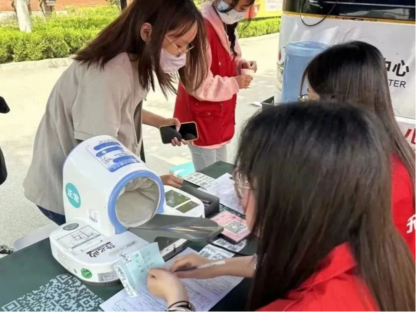 献血过程中,首先由志愿者对献血者的身体状况进行仔细询问,判断是否符合献血条件。引导符合献血标准的同学扫码填写献血登记表,并完成个人信息以及献血相关表格的填写。完成表格登记后,有志愿者对献血者进行血压脉搏的检测,进一步了解其身体健康状况。并对首次献血的同学进行耐心安抚,缓解他们的紧张情绪。