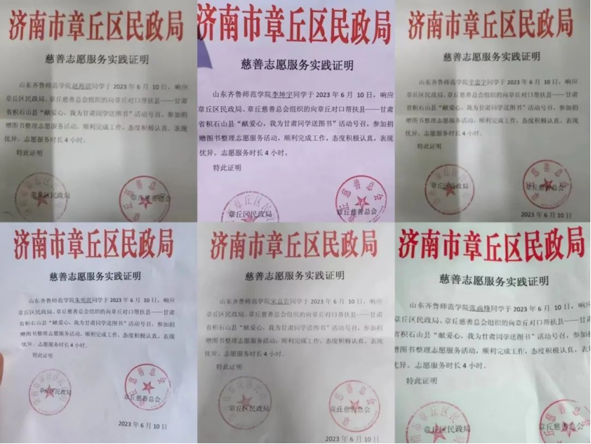 章丘区民政局与章丘慈善总会携手开展以“献爱心,我为甘肃同学送图书”的活动,帮助甘肃省积石山县的小朋友们获取更多的图书资源。2023年6月10日,我校青年志愿者协会与社工协会的志愿者们积极参与到此次活动的捐赠书整理志愿服务中。