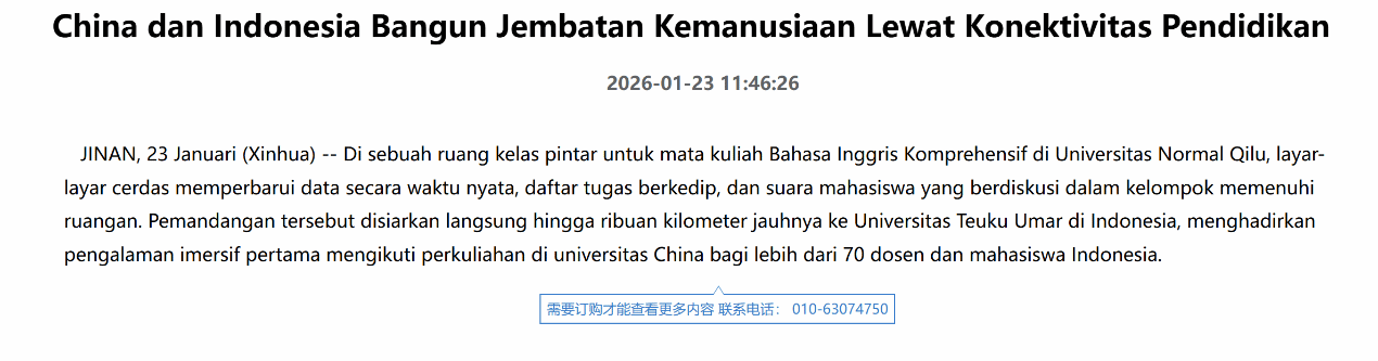 近日,新华社对学校智慧课堂建设与中印尼教育合作实践进行专题采访报道。相关新闻以印尼语标题China dan Indonesia Bangun Jembatan Kemanusiaan Lewat Konektivitas Pendidikan发布于新华全媒新闻信息服务平台,并被印尼国家通讯社 ANTARA、Netralnews 以及 Facebook“China Xinhua News”官方账号等海外媒体和平台转载发布,充分展现了学校在教育数字化转型、课程国际化建设和中外人文交流方面取得的积极成效。